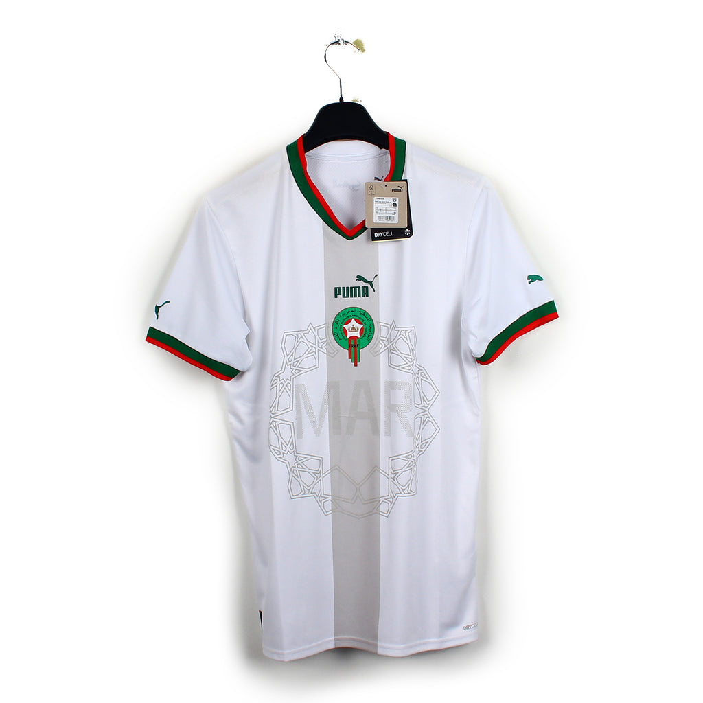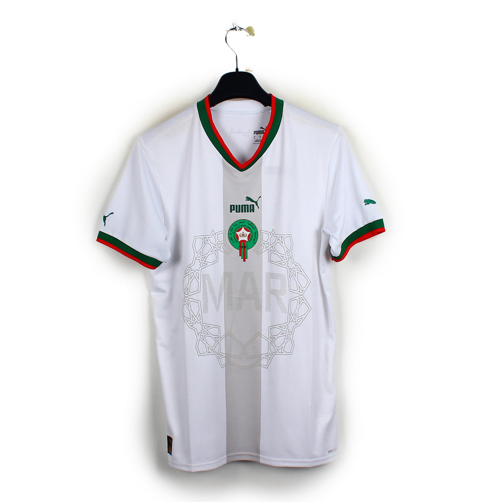 Histoire : Maillot extérieur porté par la sélection marocaine lors d'une sublime Coupe du Monde 2022 au Qatar, où les Lions de l'Atlas iront jusqu'en 1/2 finale, battus par la France.