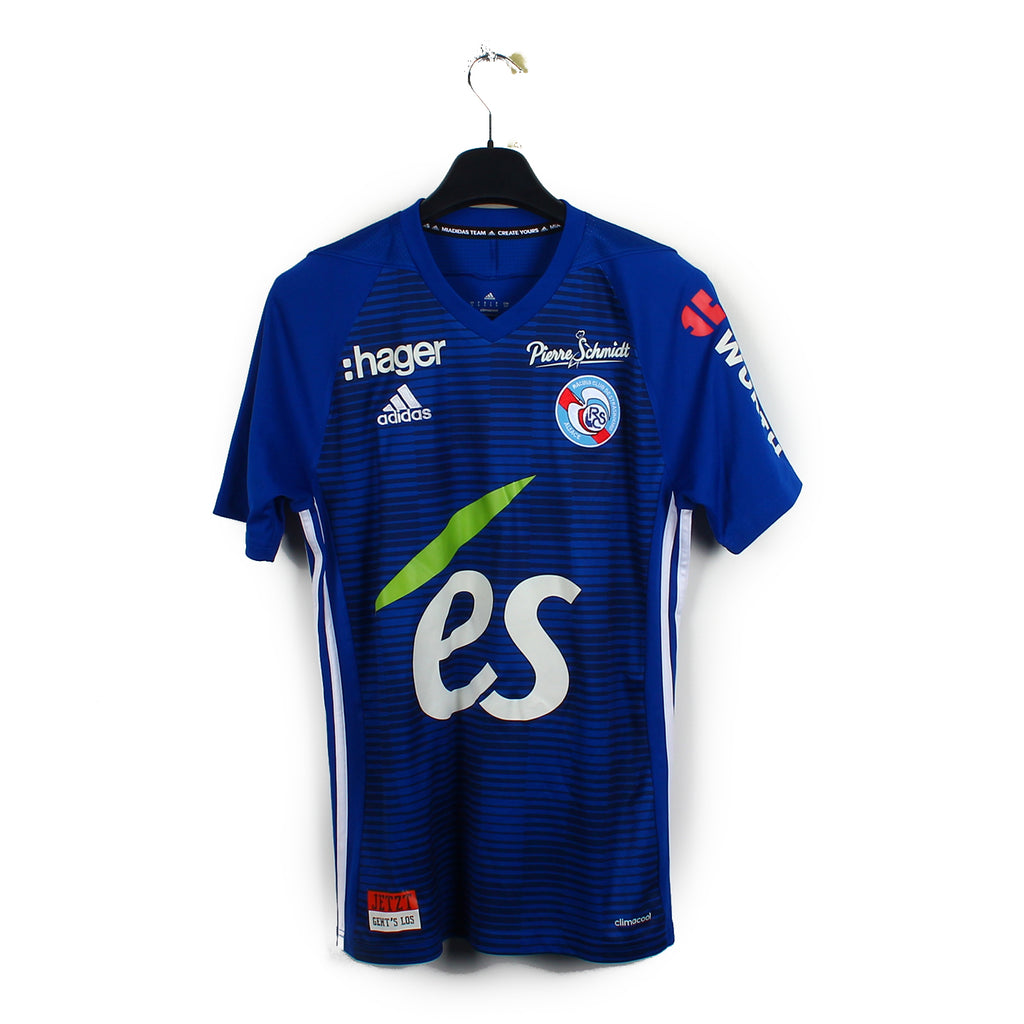 Histoire : Maillot domicile porté par le Racing lors d'une saison exceptionnelle où le club se verra sacrer en Coupe de la Ligue face à l'EA Guingamp. En championnat les alsaciens termineront à une belle 11ème place, assurant un maintien serein.
