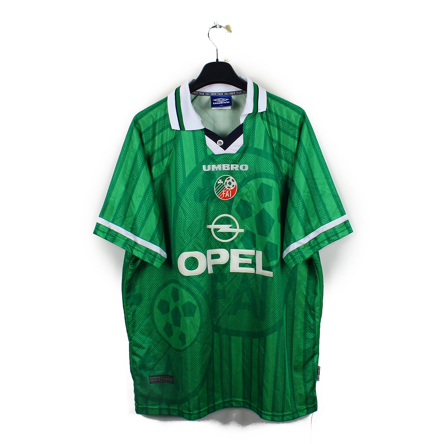 Histoire : Maillot domicile porté par les Irlandais de Mick McCarthy en vue de la Coupe du Monde 1998. Dans un groupe homogène, l'Irlande finira deuxième derrière la Roumanie, direction les playoff ! Opposés à la Belgique de Marc Wilmots, les Irlandais ne parviendront pas à vaincre les Belges, 2-3 pour le score cumulé.