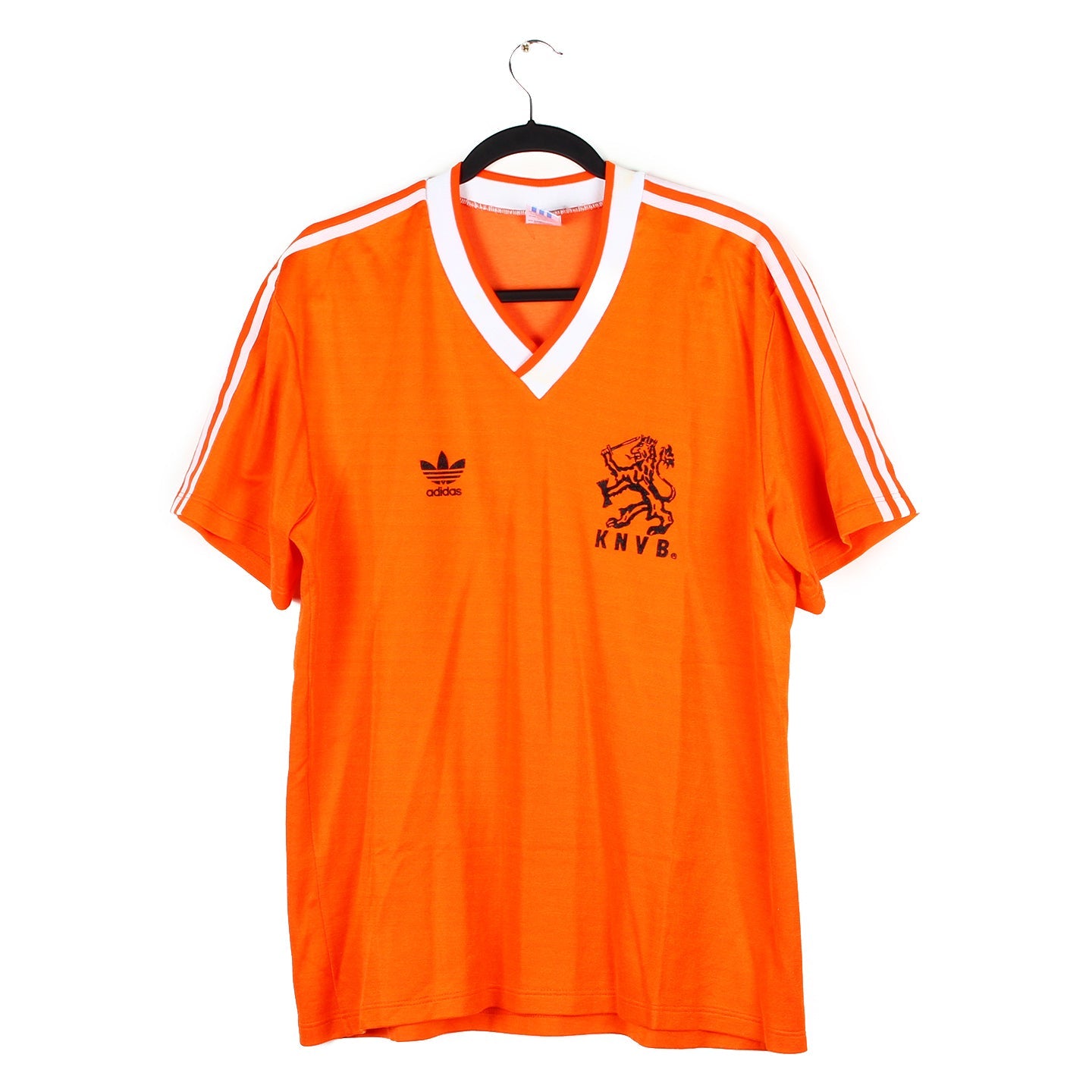 Histoire : Maillot domicile porté par les hollandais lors de la phase qualificative de l'Euro 1988. Ils sortiront premier de leur groupe et valideront leur ticket vers l'Allemagne. Ils remporteront la compétition pour la première fois de leur histoire en disposant de l'URSS en finale, après avoir battue l'Allemagne en demi.