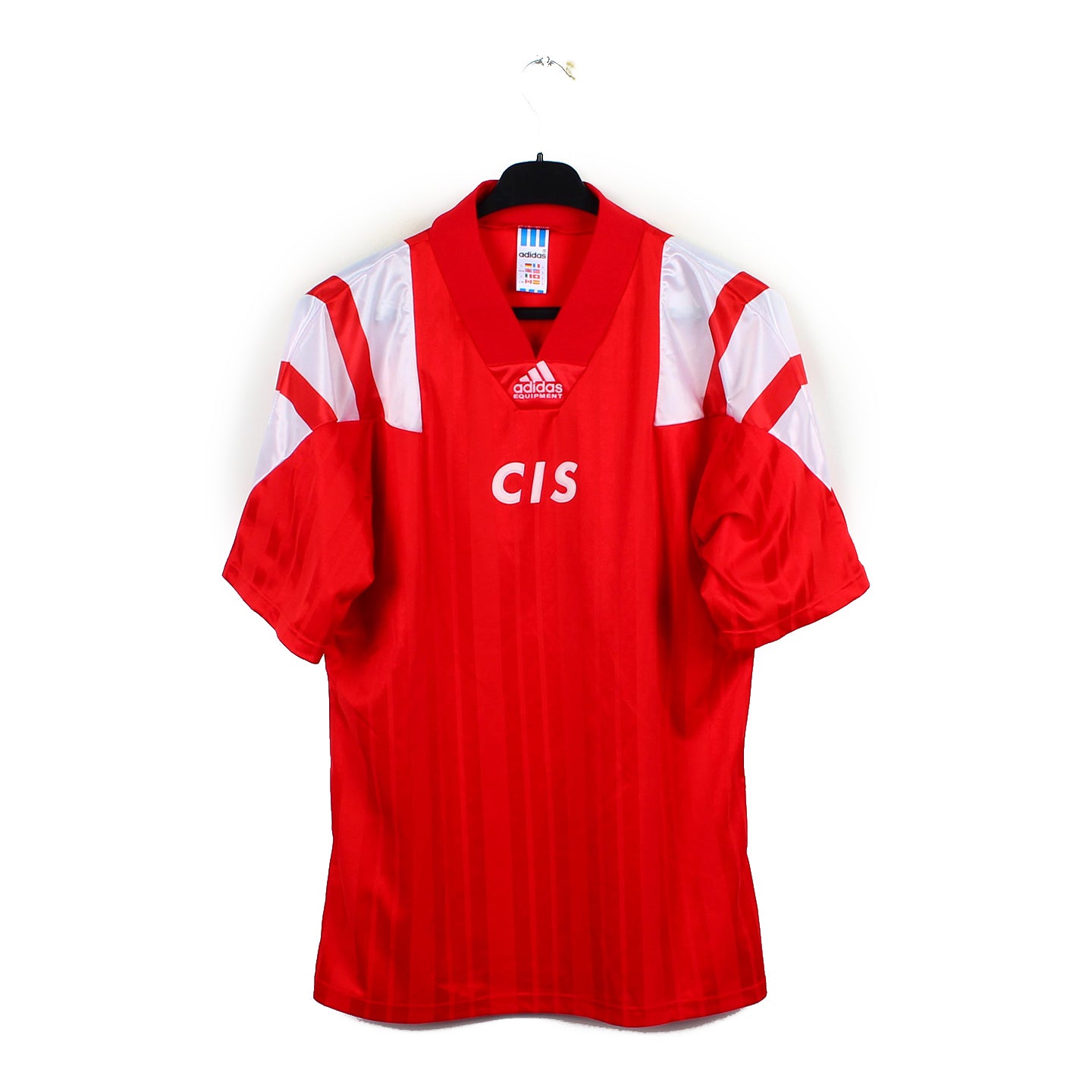 Histoire : Maillot domicile porté par le CIS lors de l'Euro 1992. L'équipe de la Communauté des Etats Indépendants remplacera l'Union Soviétique et sera composée d'une majorité de joueurs russes et ukrainiens. La compétition s'arrêtera dès les phases de groupes pour les coéquipiers d'Onopko, après 2 nuls et 1 défaites.