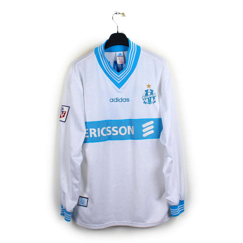 Le maillot en détail : Maillot manches longues dans un superbe état. Les logos brodés ainsi que le sponsor en feutrine sont très bien conservés, le flocage joueur aussi. Légère trace au dos, infime.