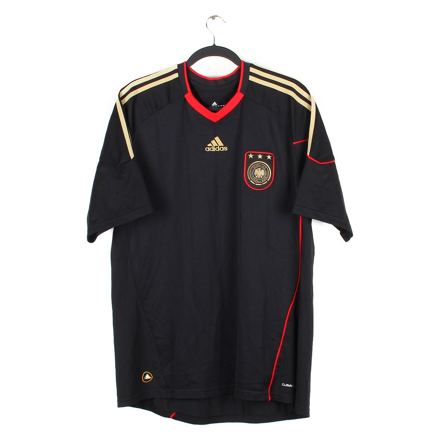Histoire : Maillot extérieur porté par le Mannschaft durant la Coupe du Monde 2010 organisée en Afrique du Sud. Malgré une défaite face à la Serbie en groupe, les Allemands termineront premier de leur groupe, leur permettant l'accès aux phases à élimination directe. Le parcours de la sélection du capitaine Lahm se terminera en demi-finale, battue 1-0 par les futurs champions Espagnoles.