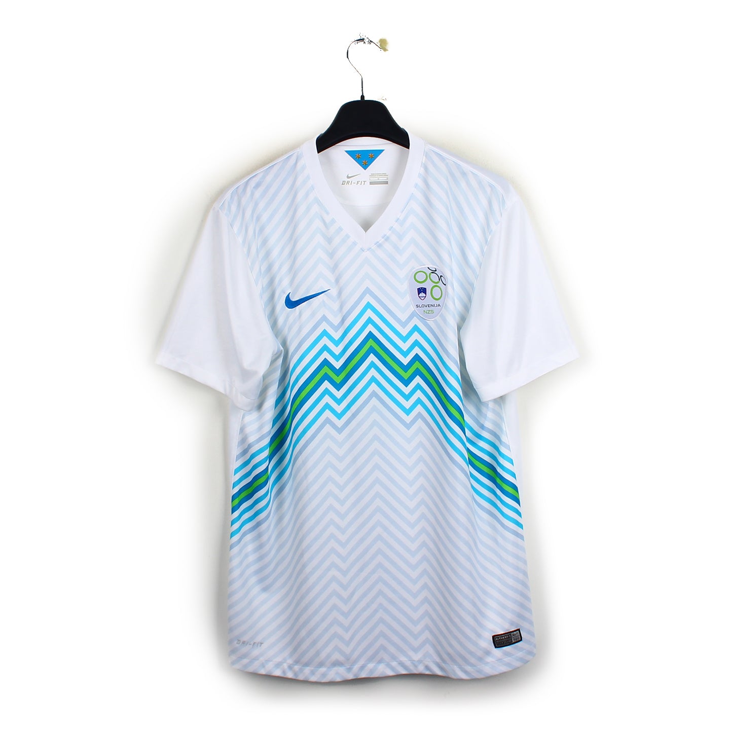 Histoire : Maillot domicile porté par les Slovènes lors des qualifications pour l'Euro 2016. Troisième de leur groupe, ils disputeront un barrage face à l'Ukraine, perdu 3-1.