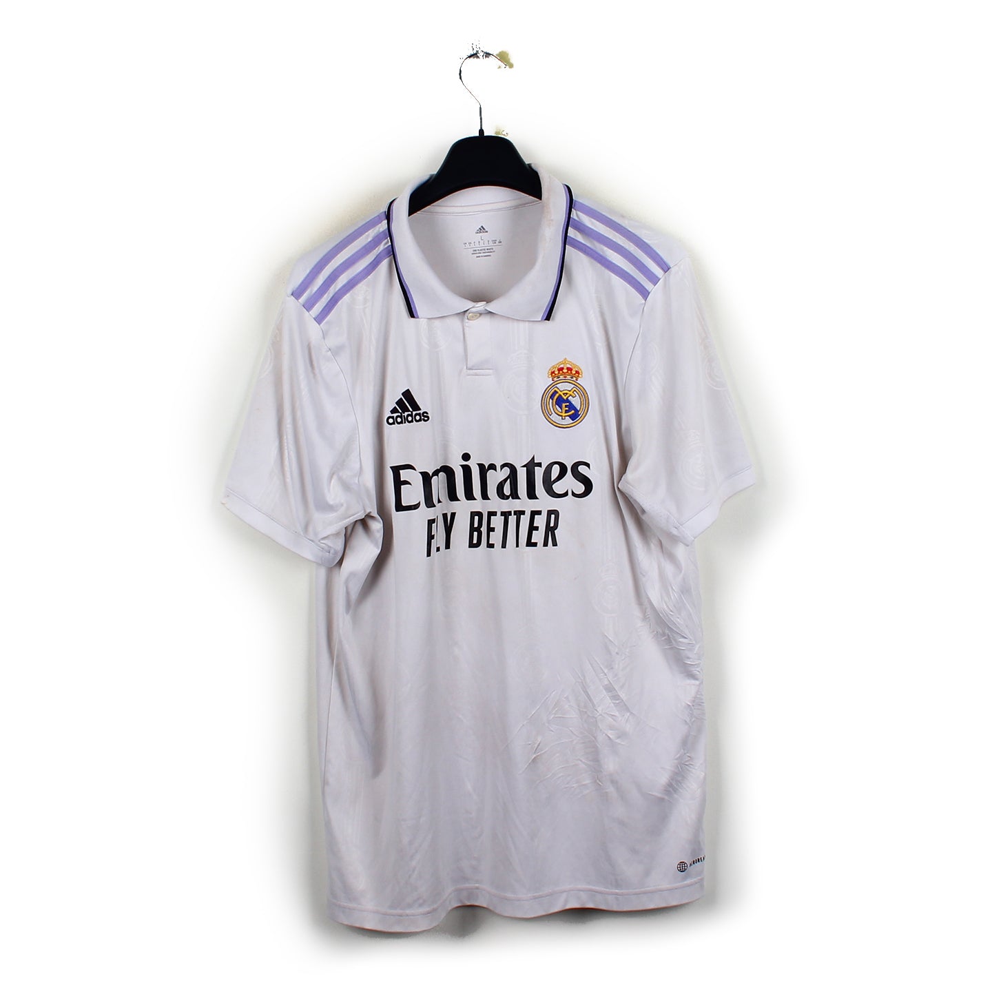 Le maillot en détail : Maillot en bon état. Les logos sont nickels, le sponsor est un brin usé et le maillot a perdu de son élcat blanc.