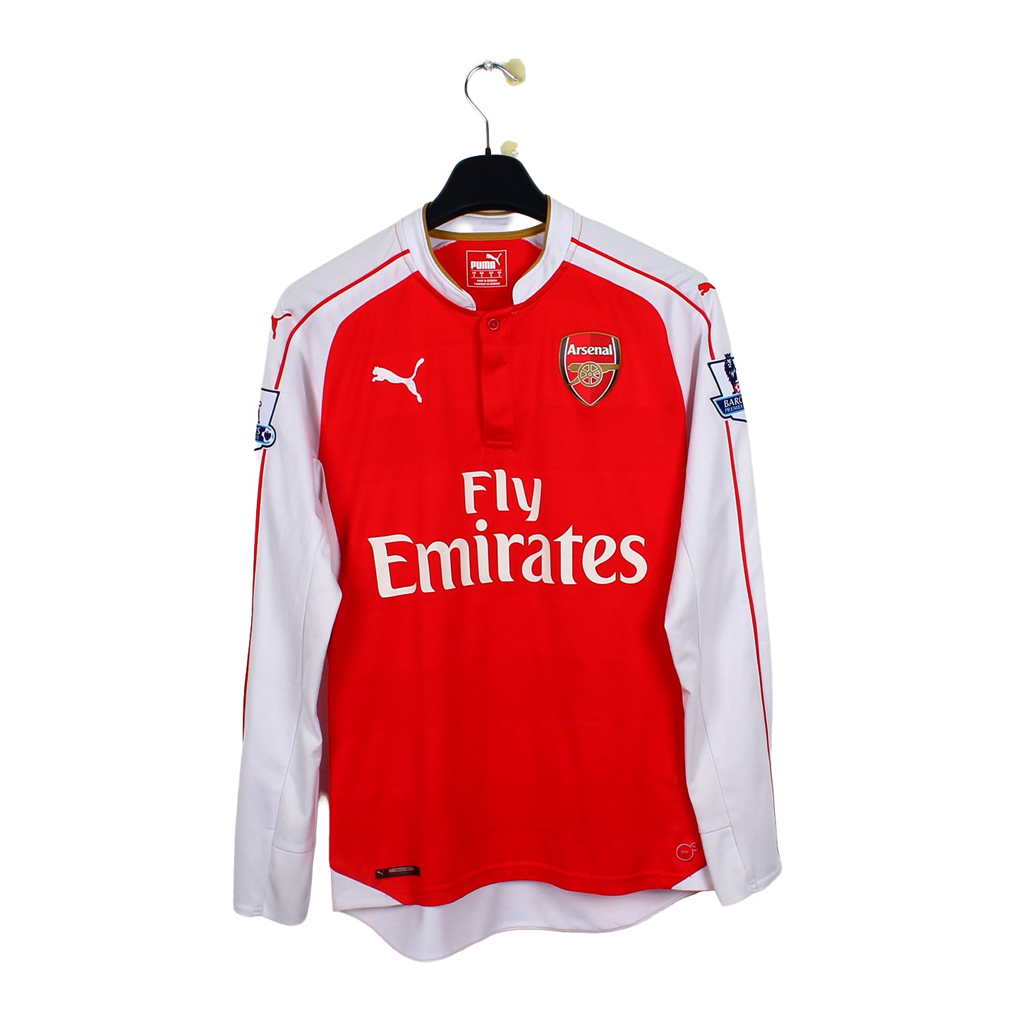 Histoire : Maillot domicile porté par Arsenal lors de la saison qui verra la légende Petr Cech, gardien de but emblématique des rivaux Chelsea, rejoindre le club. Les Gunners, au terme d'une belle saison, ne finiront que 2ème de Premier League, derrière la surprise Leicester.