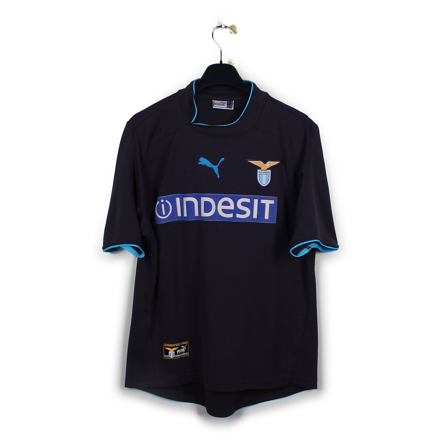 Le maillot en détail : Maillot de presque 20 ans parfaitement conservé. L'écusson de la Lazio est brodé tandis que les autres éléments sont en feutrine. Le sponsor est un brin poussiéreux.