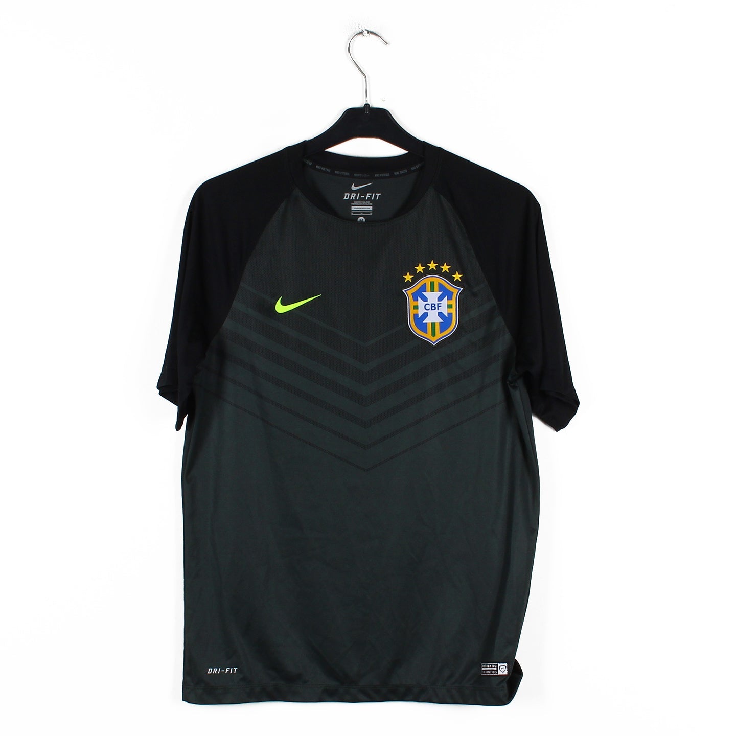 Histoire : Maillot d'entraînement porté les brésiliens lors de la Coupe du monde 2014 qu'ils disputeront sur leurs terres. Après un bon début de tournoi, le scénario est catastrophique avec une blessure de Neymar en quart de finale, face à la Colombie, avant l'humiliation 7-1 reçu face aux Allemands en demi.