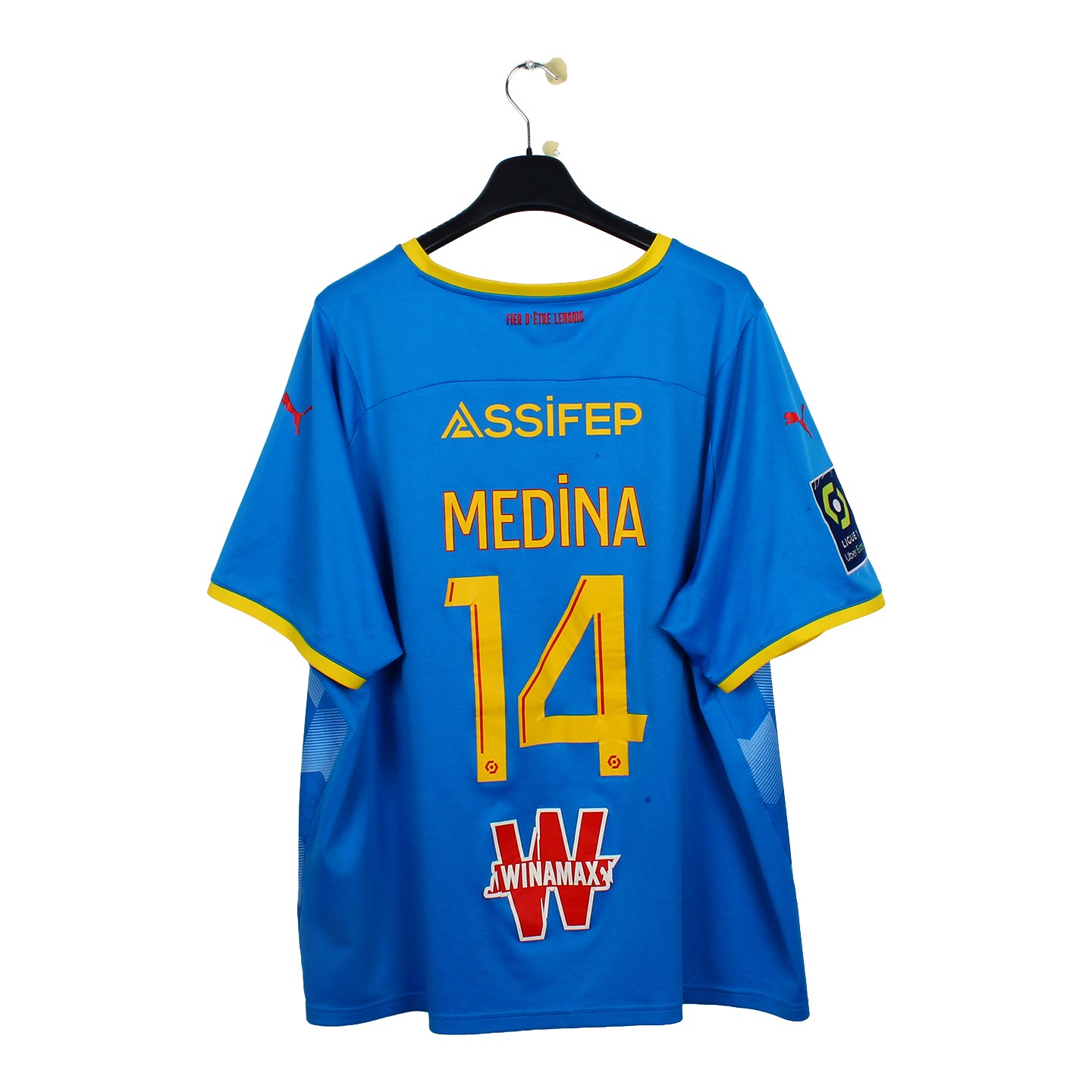 Le maillot en détail : Maillot dans une bonne conservation. Les logos sont intacts, le sponsor aussi, plusieurs bouloches et accros sont à noter.